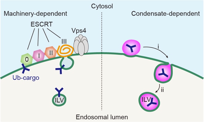 Figure 1. A model of ESCRT machinery-dependent and FREE1 condensate (magenta)-mediated ILV formation pathways from MVB membranes (green). (i) membrane invagination, (ii) membrane scission. Blue Y shapes indicate ubiquitinated cargoes.