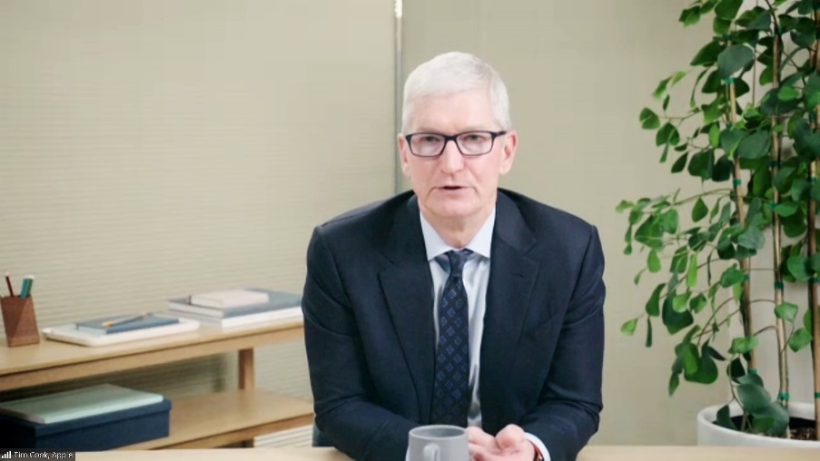 Tim Cook, chairman of Tsinghua SEM Advisory Board and CEO of Apple, speaks at the meeting, Oct. 19, 2021