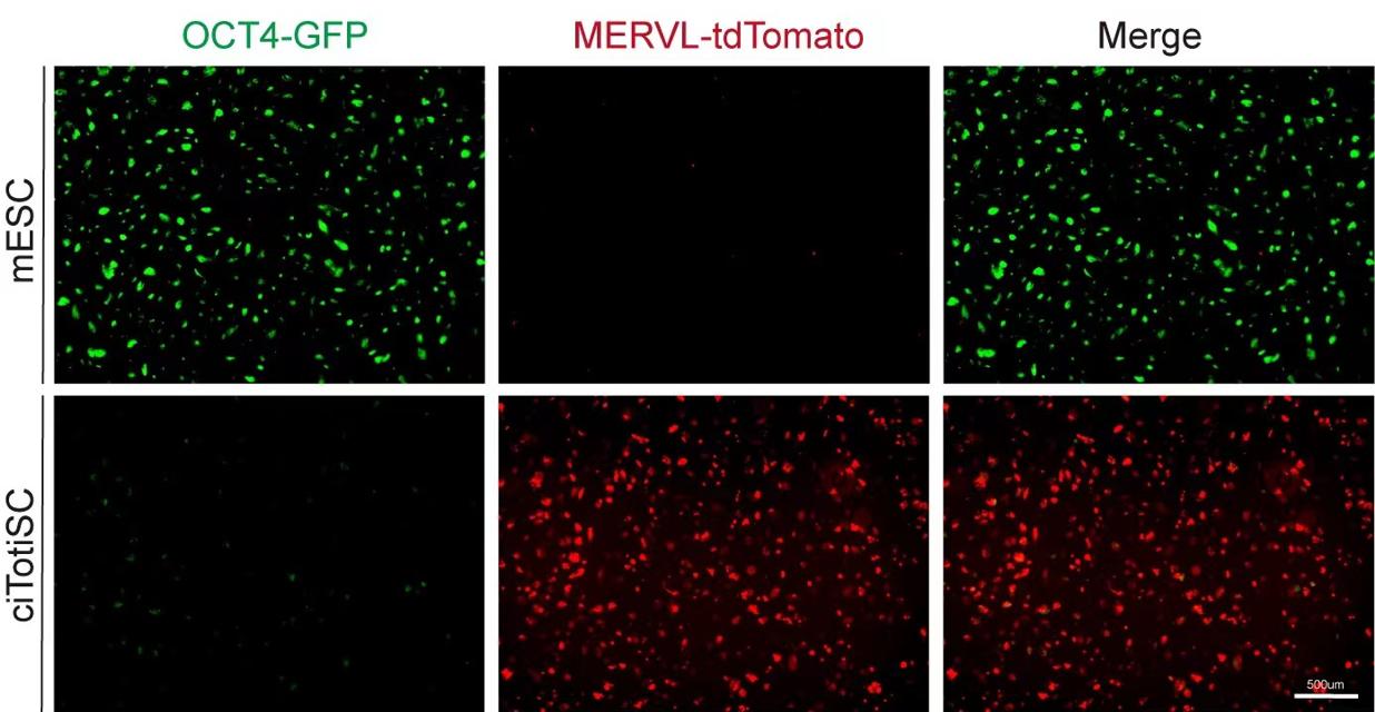 Chemically induced ciTotiSC from mESC (OCT4-green fluorescence-labeled pluripotent stem cells and MERVL-red fluorescence-labeled totipotent stem cells)