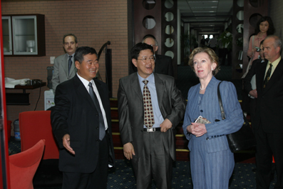 Before delivering the speech, Mrs. Beckett firstly paid a visit to the BP center, where she attended a symposium on energy resources. Vice President He Jiankun hosted the symposium. Prof. Wu Zongxi, academician Ni Weidou, and prof. Zhu Yingxin gave presentations respectively on China’s energy situation and development, renewable energy in China, and building efficiency in China. Ambassador Christopher Hum accompanied on the visit.