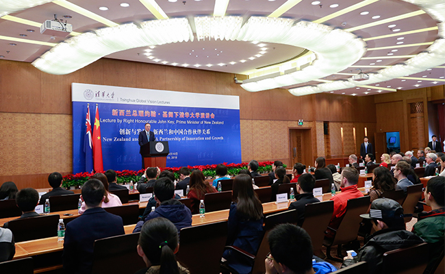 New Zealand Prime Minister John Key visited Tsinghua University and delivered a speech to the Tsinghua Global Vision Lecture Series on April 19th.