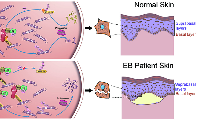 Professor Xu Tan’s research group of School of Pharmaceutical Sciences of Tsinghua University, in collaboration with Professor Yong Yang and Zhimiao Lin’s group of Peking University First Hospital, have identified a new causative gene and a novel disease causing mechanism of a serious genetic skin disorder-epidermolysis bullosa. This gene, named KLHL24, has been identified as an important gene to regulate the differentiation and protein homeostasis of the skin. The study has also uncovered a signaling transduction pathway for the ubiquitination and degradation of keratin proteins in the skin and suggested a new approach to treat related skin disorders.