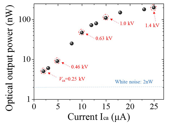 To verify this theoretical result, in the next two years they overcame lots of difficulties in experiment, such as the fabrication of planar electron emitter on chip, the multilayer HMM with thickness of ten nanometers for each layer, the plasmonic nano-slits, and the measurement of CR in HMM. Finally, they succeeded in observing the threshold-less CR by extracting the free electrons from nano-scale Mo tip and having the electrons fly a distance of 200 micron above parallel to the surface of HMM with height of only 40nm. The wavelength of CR ranges from 500~900nm and the electron energy is only 250~1400eV, which is two to three orders of magnitude lower than previous reports. The measured output light power reaches 200nW, which is two orders of magnitude higher than free electron light source by using other nanostructures.