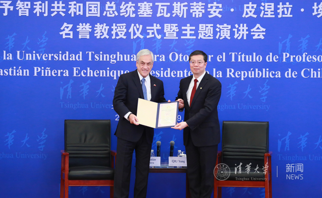 On April 25th, on the occasion of the 108th anniversary of Tsinghua University, Sebastian Pinera Equeniche, President of the Republic of Chile, visited Tsinghua University. During his visit, President Pinera received the title of Honorary Professorship of Tsinghua University and delivered a speech entitled "Chile and China: Facing Together the Challenges and Opportunities of the Future".