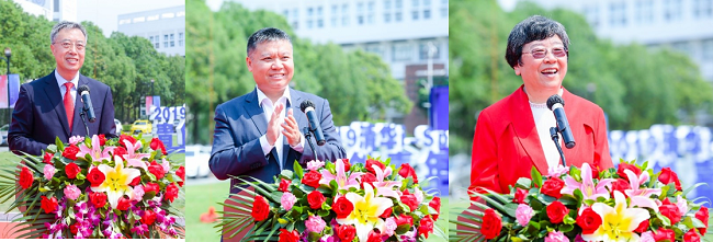 From left: Tsinghua SIGS CPC Committee Secretary Wu Xiaofeng, Shenzhen Vice Mayor Wang Lixin, and Tsinghua University Council Vice Chairperson Han Jingyang speak at the Tsinghua SIGS sign unveiling.