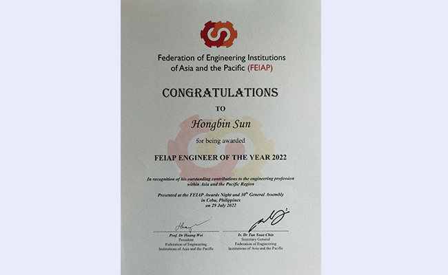 Recommended by the China Association for Science and Technology (CAST), Sun Hongbin, a Professor of Tsinghua University, won the FEIAP Engineer of the Year 2022 award.