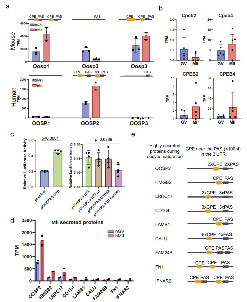 Mouse models are often used to study and infer the mechanisms of human oocyte maturation; however, there are some unique translational expression patterns that may only exist in human oocytes, so conclusions drawn from mouse data alone may not be applicable to human oocytes. Based on T&T-seq of mouse and human oocytes, the authors compared and contrasted the translation sets of these two species, and identified some genes with different translational patterns, such as those of the OOSP protein family. In the mouse OOSP family, both OOSP1 and OOSP3 proteins are up-regulated during maturation, while OOSP2 is down-regulated during maturation. In the human OOSP family, however, the opposite is true. The authors found that the mouse OOSP2 gene has only one PAS motif (RNA sequence element at 3’ untranslated region of mRNA), while both OOSP1 and OOSP3 have multiple CPE motifs (RNA sequence element at 3’ untranslated region of mRNA) adjacent to the PAS motif. In contrast, the human OOSP2 is the only OOSP gene that carries both CPE and PAS (Fig. 3).