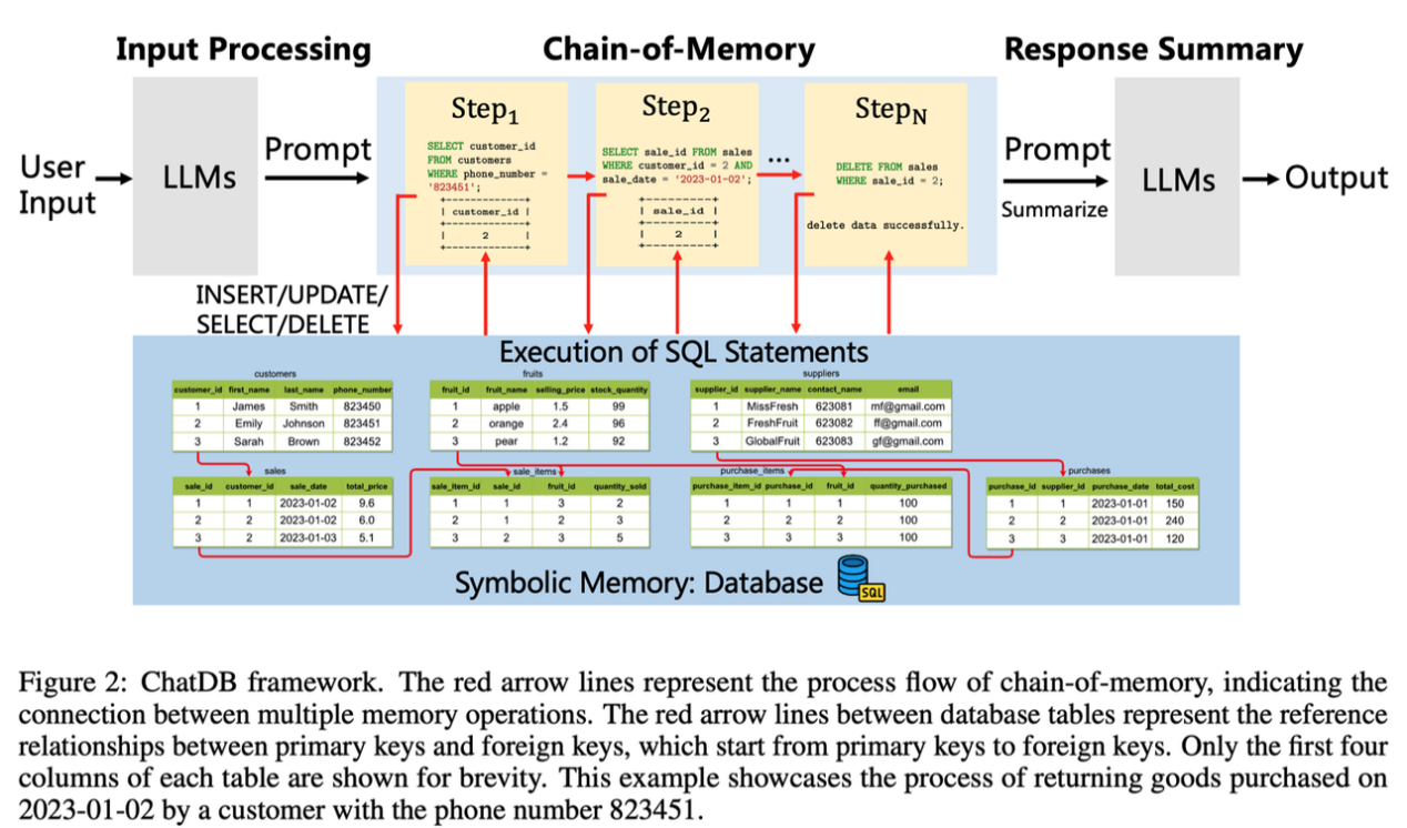 The ChatDB framework consists of three main stages: input processing, chain-of-memory, and response summary. In the “input processing”, ChatGPT generates a series of intermediate steps to manipulate the symbolic memory by LLMs based on users’ input. When it comes to the “chain of memory”, ChatDB manipulates the symbolic memory in sequence according to a series of previously generated SQL statements, including operations such as insert, update, select, delete, etc. In the last step, ChatDB summarizes the final response to the user based on the results of a series of chain-of-memory steps.