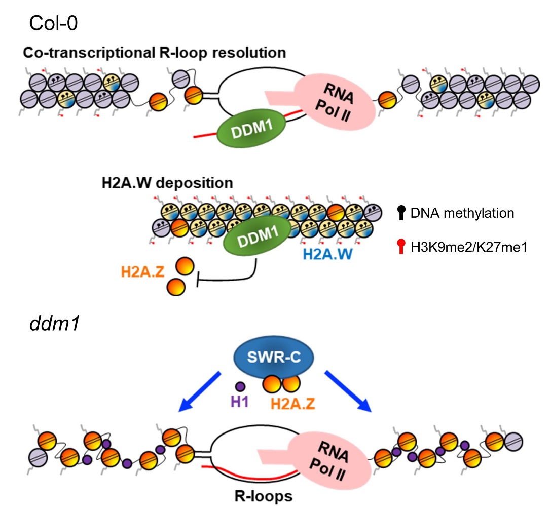 In summary, this study reveals that DDM1, a chromatin remodeling protein in Arabidopsis, plays a major role in excluding the accumulation of H2A.Z in heterochromatic regions and resolving R-loops, thus initiating heterochromatin formation. It elucidates a novel molecular mechanism and biological significance of DDM1 in maintaining genomic DNA methylation.
