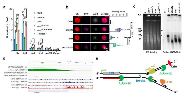 In previous studies, the researchers revealed that the chloroplast-localized RNase H1 protein AtRNH1C can form a complex with chloroplast-localized DNA Gyrases (AtGyrases) and resolve HO-TRCs and R-loops in the rDNA HO-TRCs regions, thus maintaining genome integrity. Mutation of AtRNH1C leads to the formation of aberrant R-loops at these regions, causing genome breaks in chloroplast and growth defects.