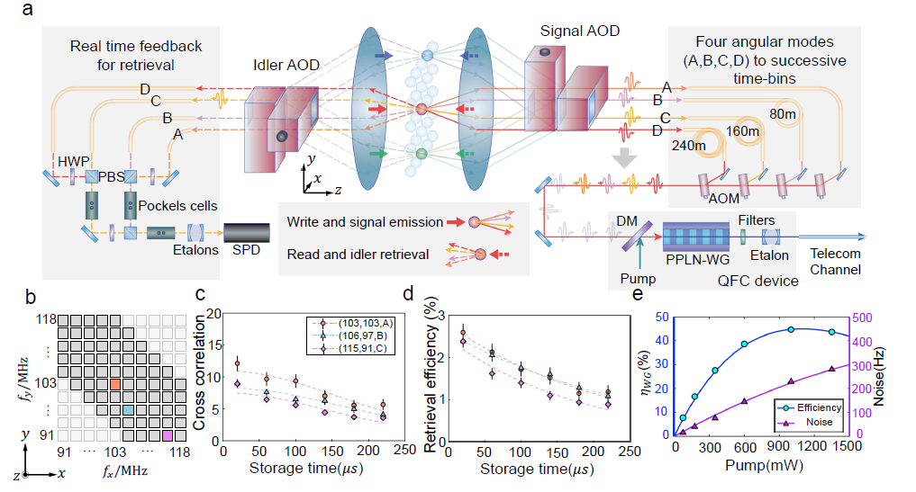 The research group led by Prof. Yunfei Pu and Prof. Luming Duan from Tsinghua’s Institute for Interdisciplinary Information Sciences has recently achieved multiplexing-enhanced generation of heralded atom-photon quantum entanglement over a 12 km fiber with a cold atom quantum repeater node. This work breaks several world records for metropolitan-scale (>10 km) quantum network, including: 1. The distribution rate of heralded atom-photon quantum entanglement over metropolitan distance (1.95 kHz); 2. The ratio of atom-photon entanglement generation rate to the quantum memory decoherence rate for metropolitan-scale fiber (also known as “link efficiency", reaching 0.46 in this work); 3. The enhancement factor of entangling rate through multiplexing (280 modes, 140-fold enhancement). The findings were published in Nature Communications, with the title "Fast delivery of heralded atom-photon quantum correlation over 12 km fiber through multiplexing enhancement."