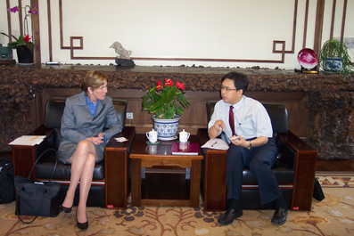 Vice President Gong introduced the history of Tsinghua University, the students’ research training program, the English summer camp held for the freshmen of 2003, Tsinghua’s cooperation with other universities, and so on. They talked about the cooperation of Tsinghua and Yale University in the fields of environment, management, and law, and exchanged ideas on possible collaborations.