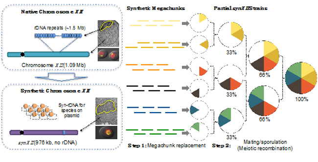 Among the sixteen chromosomes, Chromosome XII is unique as one of the longest yeast chromosomes (approximately 1 million base pairs) and additionally encodes the highly repetitive ribosomal DNA locus, which forms the well-organized nucleolus. A 976,067-base pair linear synXII was designed based on the native chromosome XII and chemically synthesized. synXII was assembled using a two-step method (Figure 1), involving successive megachunk integration to produce six semi-synthetic strains, followed by meiotic recombination-mediated assembly, yielding a full-length functional chromosome in S. cerevisiae.