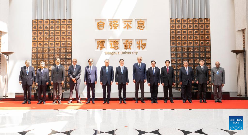 Chinese Vice President Han Zheng poses for a group photo with guests ahead of the opening ceremony of the 12th World Peace Forum in Beijing, capital of China, July 6, 2024. Han addressed the opening ceremony here on Saturday. (Xinhua/Li Tao)