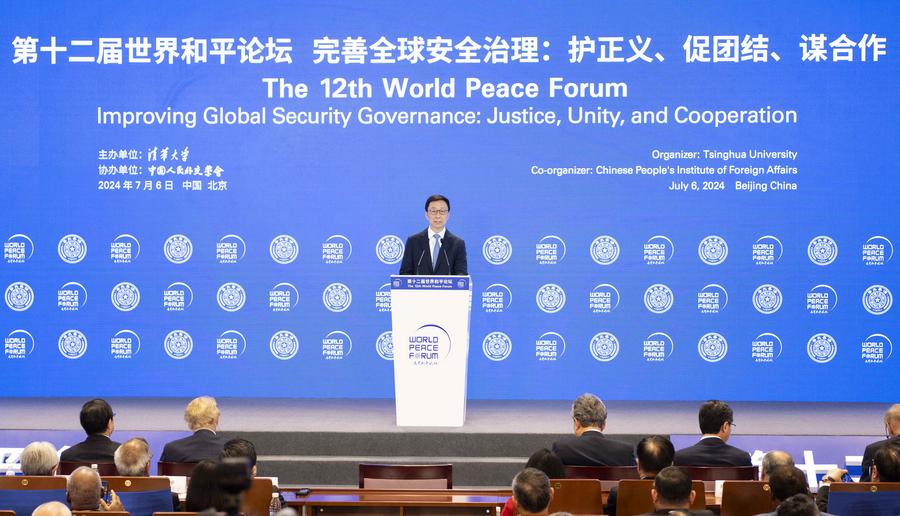 Chinese Vice President Han Zheng addresses the opening ceremony of the 12th World Peace Forum in Beijing, capital of China, July 6, 2024. (Xinhua/Li Tao)