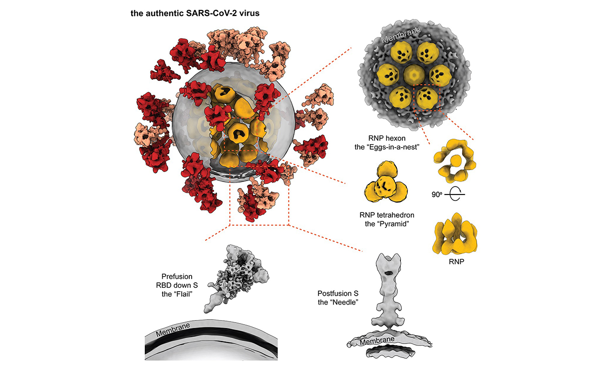 SARS-CoV-2 was shown by Tsinghua researchers to move to an up to 40-degree angle to the virus envelop (bottom left), which is an unusual amount of mobility. The ribonucleoprotein packaging of the virus was also the first to be documented of any positive-strand RNA virus, with hexagon and pyramid assemblies both revealed.