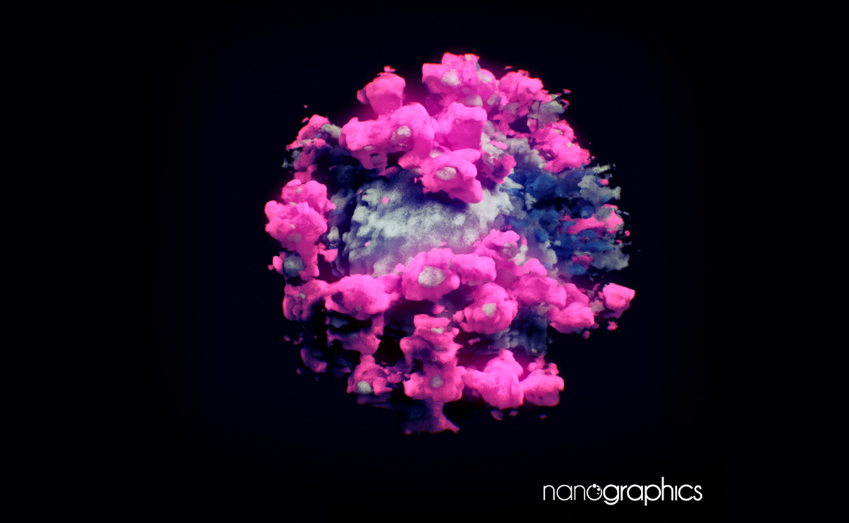 An image of SARS-CoV-2 created using cryo-electron tomography by Tsinghua, and cleaned up and colored by Nanographics GmbH and the King Abdullah University of Science and Technology in Saudi Arabia. (Credit: Nanographics GmbH/https://https://nanographics.at/projects/coronavirus-3d/ Creative Commons Attribution 4.0 International License: https://creativecommons.org/licenses/by/4.0/)