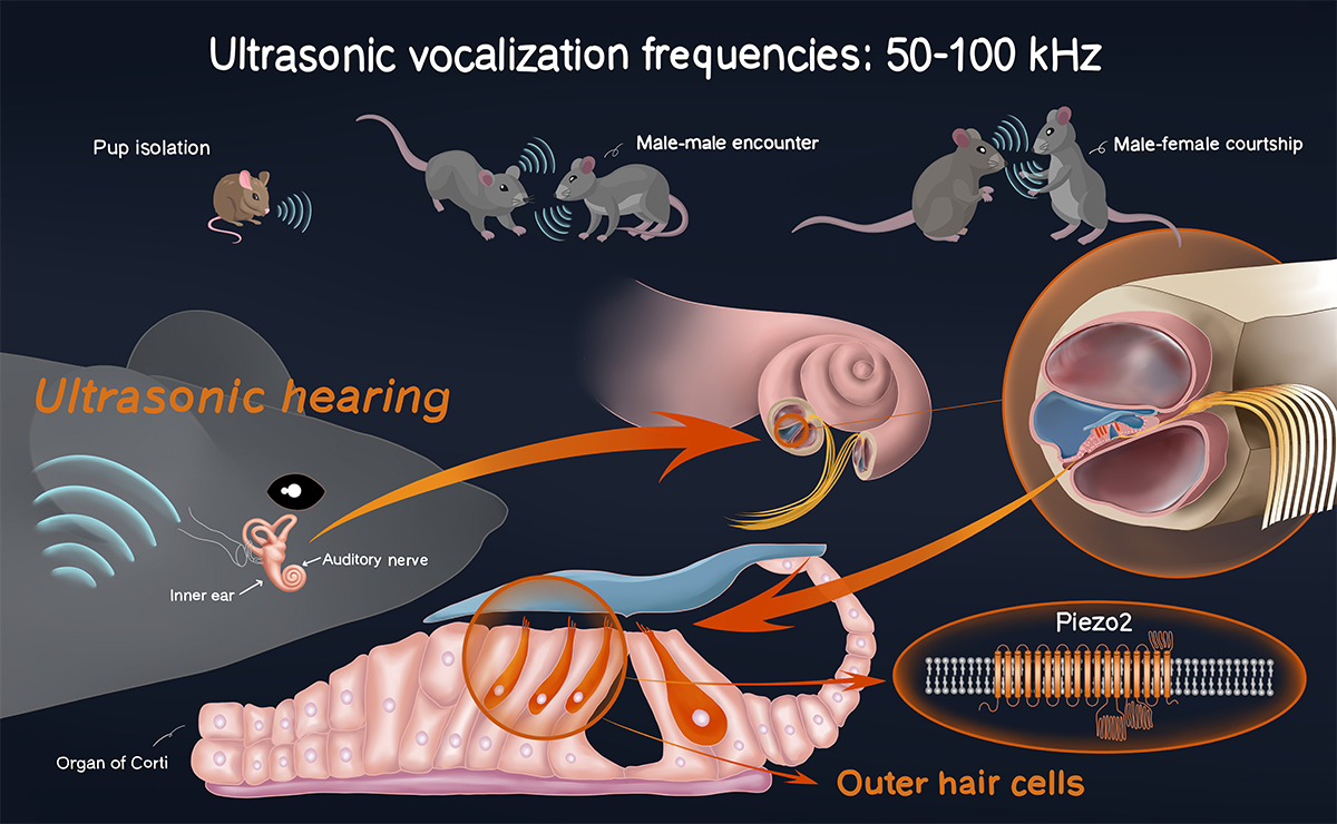Mice vocalize at frequencies higher than 25 kHz during certain social behaviors, including mother–pup interactions, male–male encounters, and male–female courtship. Mice without Piezo2 ion channels, which are mostly found in the membranes of outer cochlear hair cells, weren’t as responsive in ultrasonic behavioural tests, suggesting that this channel may be key to their ultrasonic hearing.