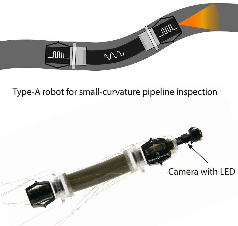 This soft robot that uses the same movements as an earthworm to move through a narrow pipe – anchoring by expanding its front or back sections to brace against the tunnel or pipe walls, and then extending its middle sections to move forward.