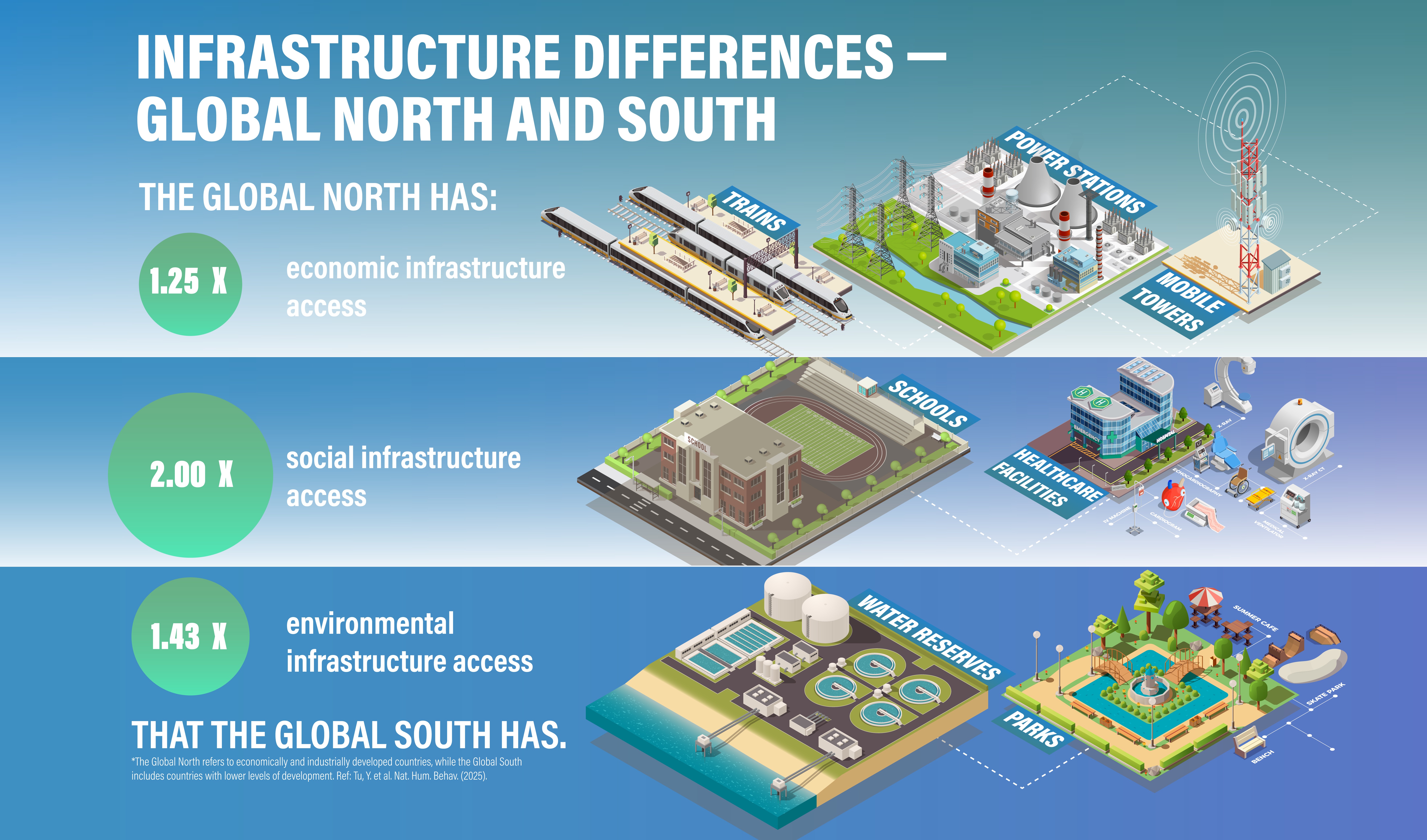 The results confirmed in numbers what many development experts have long known: infrastructure access is not only lower in the global south, but also more unevenly distributed. “People in these countries face a double disadvantage,” Xu says. “They have less infrastructure overall, and what exists is often concentrated in wealthier or urban areas.”