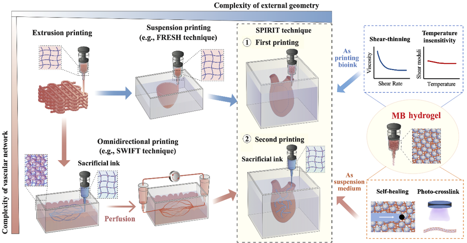 Compared with current 3D bioprinting strategies, the SPIRIT technique has the potential to create tissues and organs with extraordinary complexities in both external geometries and internal structures. The SPIRIT technique includes several separate printing processes as follows: i) First printing: we print MB bioink into a Carbopol or gelatin microparticles-based suspension medium to generate complex external structures such as chambered ventricles; ii) Second printing: upon the completion of the first printing process, we print a sacrificial ink such as P-F127 or gelatin into the freshly printed yet uncrosslinked constructs to generate a freeform vascular network by capitalizing the reversible self-recovery behavior of MB bioink; (iii) Crosslinking: we crosslink the printed tissue constructs by in situ photo-crosslinking or incubation at 37℃ while retaining the structural integrity of printed constructs in step (i) and (ii). (iv) Removal of suspension medium and sacrificial ink: We remove the printed constructs from the suspension medium by temperature changing or dilution while the sacrificial ink can be removed simultaneously or separately (Figure 5a).