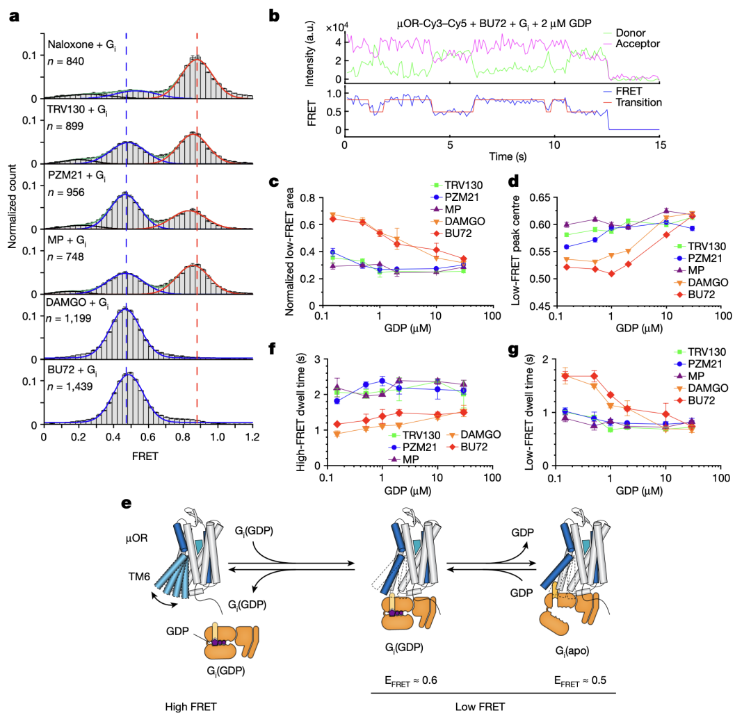 SmFRET experiments corroborated the DEER findings (Figure 3). µOR favored inactive conformations with low-efficacy ligands and active conformations with high-efficacy ligands. Labeling the intracellular loop 2 (ICL2) instead of TM4, smFRET detected two high-FRET states in the presence of antagonists or low-efficacy ligands, indicating conformational changes related to ligand efficacy. Additionally, smFRET observed µOR conformational transitions between active and inactive states in the presence of G protein and varying GDP concentrations (Figure 4), revealing two G protein-bound states: GDP-bound (EFRET = 0.6) and GDP-free (EFRET = 0.5). High-efficacy ligands accelerated G protein binding and GDP release, enhancing GTP binding and downstream signaling.