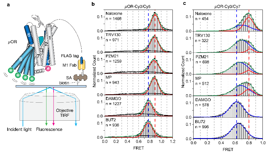 Figure3. SmFRET distributions of µOR–Cy3/Cy5 (b) and µOR–Cy3/Cy7 (c) in the presence of different ligands.