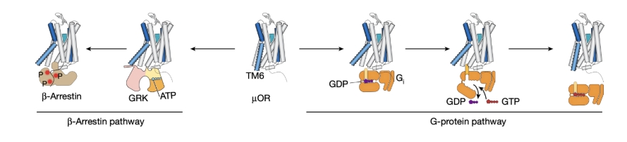 The µ-opioid receptor (µOR) belongs to the G protein-coupled receptor (GPCR) family, a group of membrane proteins crucial for receiving external signals and initiating cellular responses. GPCRs play essential roles in various physiological processes, making them prime targets for drug development. GPCRs are known for their complex and dynamic nature, capable of adopting multiple conformations in response to ligands, which in turn activate downstream G proteins or β-arrestin pathways (Figure 1).