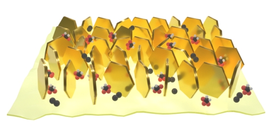 The team’s new catalyst, composed of MoS2 (hexagons) growing vertically on Co9S8 (yellow base), has large number of exposed, active edge sites.