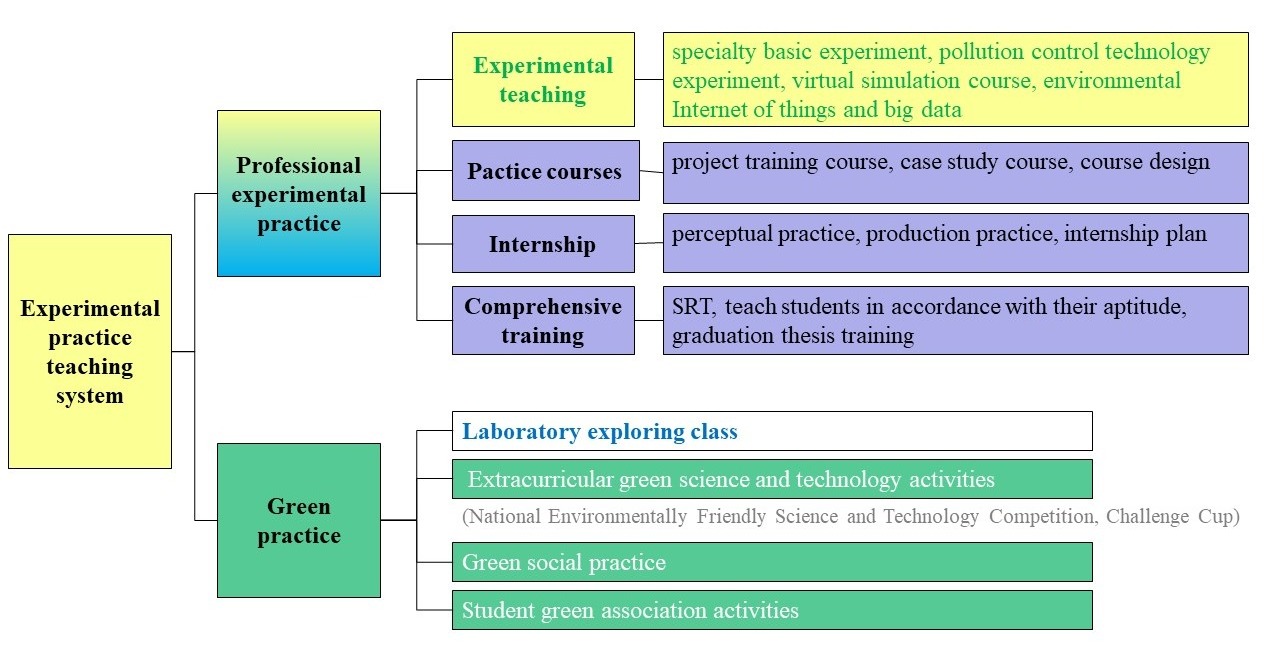Through years of exploration and practice, the School of Environment has gradually formed a new type of teaching system with clear structure, rich content, clear objectives and standardized management, including professional experimental practice system and green practice system, as shown in the figure below.