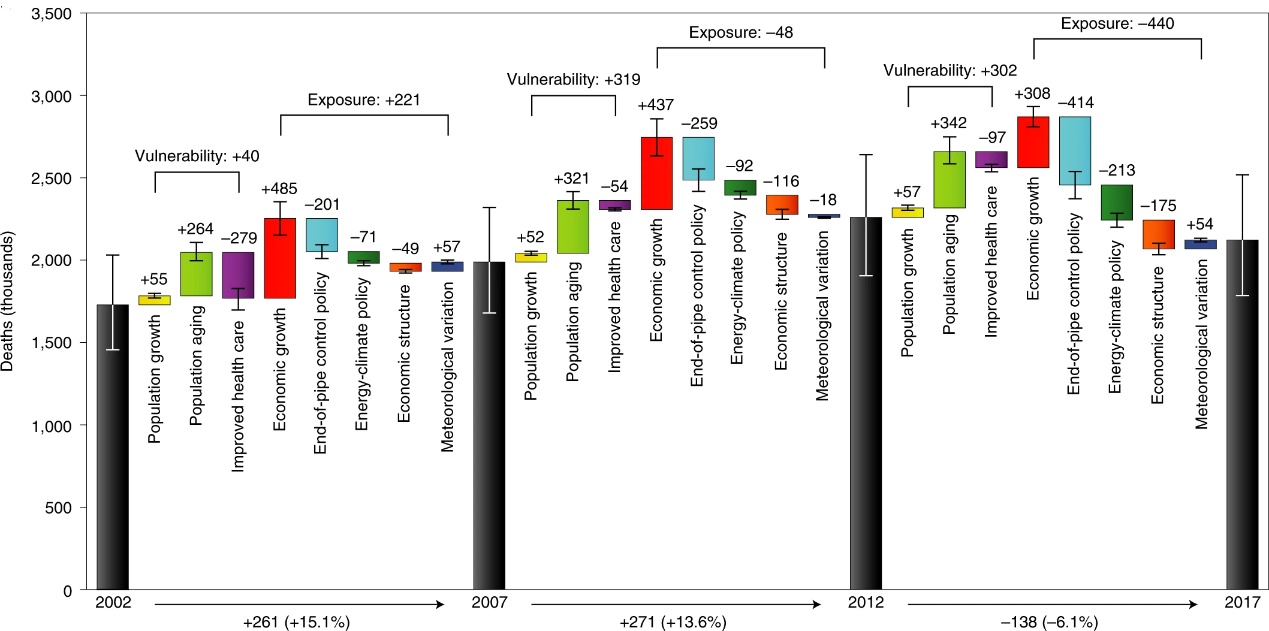 The study also found that the overall meteorological variation was unfavorable in this period, increasing 90,000 PM2.5 pollution-related deaths. As to population vulnerability, PM2.5 pollution had a much more severe impact on the health of the elderly. The total population growth and the aging process increased 1.09 million PM2.5-related deaths, while the improved medical conditions prevented 430,000 potential deaths.