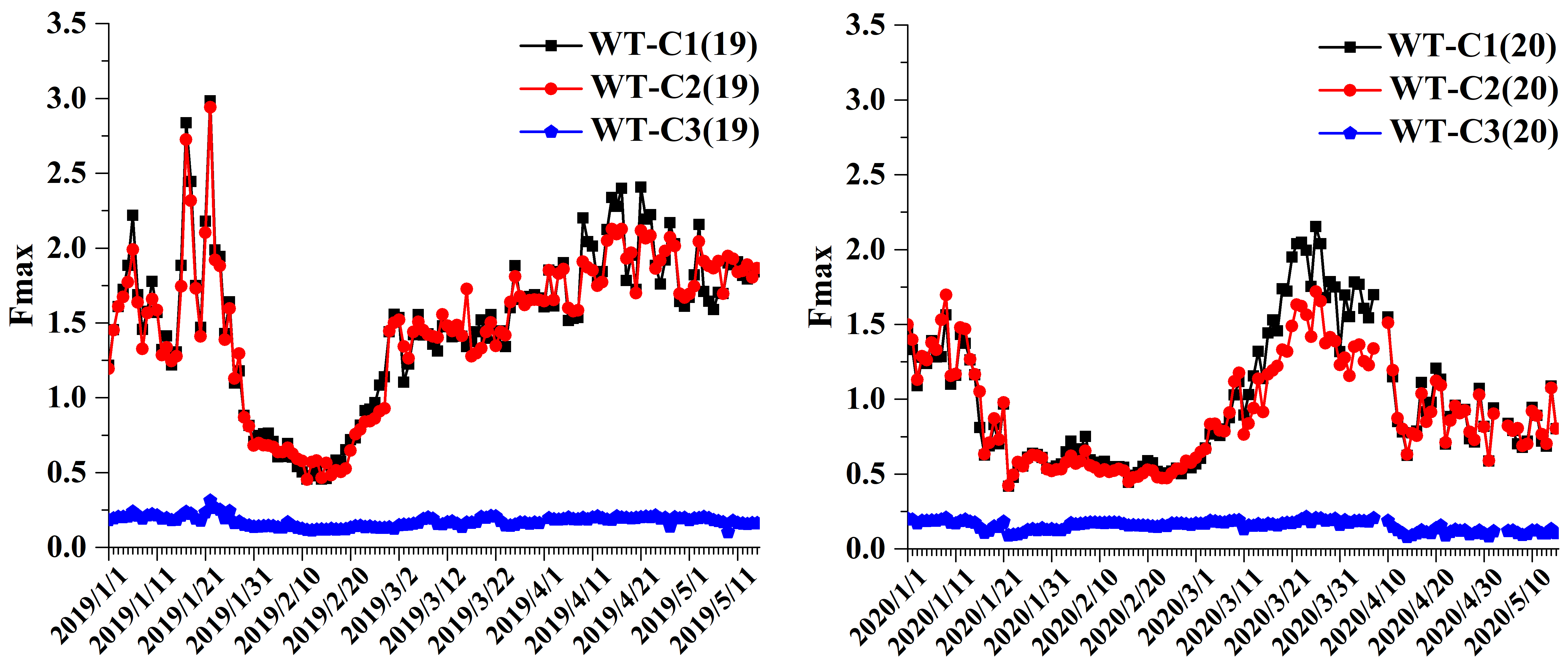 Figure 3 Intensity variations of three fluorescent components in water bodies at a monitoring sections of Beijing-Hangzhou Grand Canal in southern Jiangsu region from January 1 to May 15 in 2019 and 2020, respectively