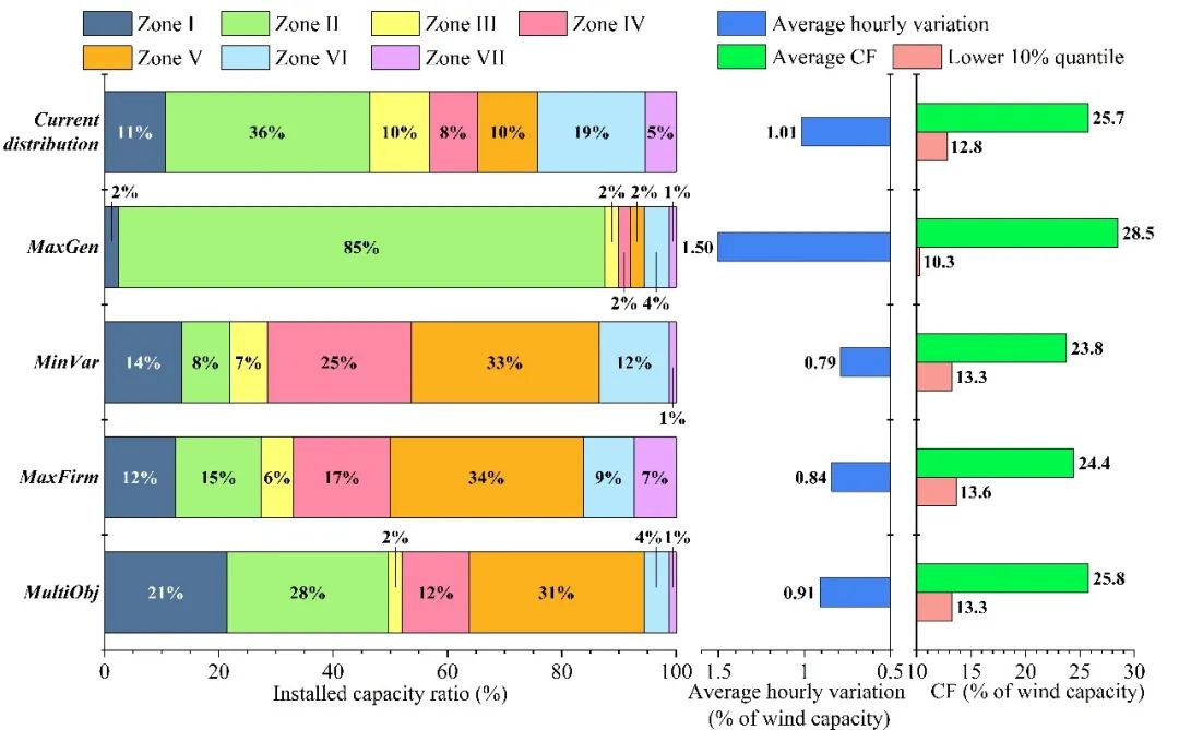 The study results show significant variations in the seasonal and intra-day capacity factors of wind power in each wind zone due to the dominant weather system and geographical conditions (Figure 1b and Figure 1d). This finding provides a theoretical basis for reducing variability and improving the reliability of a joint inter-regional wind power grid. The study further demonstrates that to obtain 800 GW of onshore wind power installed nationwide by 2030, the multi-objective optimization scenario (MultiObj) results in a 0.2% increase in wind power capacity, a 10.3% decrease in average hourly power variation, and a 3.7% increase in reliable capacity compared to the baseline scenario that maintains the current distribution ratio of installed wind power (Figure 2). Through further analysis of each zone’s wind power penetration, the study points out the significance of coordinating cross-regional UHV transmission lines with wind power development in the future. The study results provide a foundational reference for the green and low-carbon transition of China's power system and wind power development path planning under the goal of carbon peaking by 2030 and carbon neutrality by 2060.
