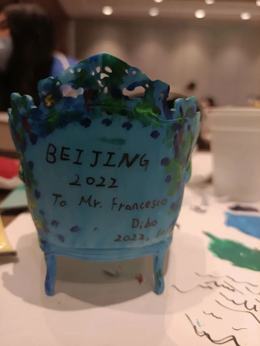 Before Mr. Francesco left Beijing, Liu Dipo wanted to give him a special gift. Liu remembered that he had brought with him some 3D printed white models from the Tsinghua Art Museum, and one of them was a chair model of the work of the famous Italian designer Mendini. "If I embellish some winter Olympics elements on the chair, wouldn't it be a nice story about an Italian old man meeting with the Beijing Winter Olympics?" Liu, who never learned painting, spent a whole afternoon designing the chair with “BEIJING 2022” and painting the chair with his acrylic paints.