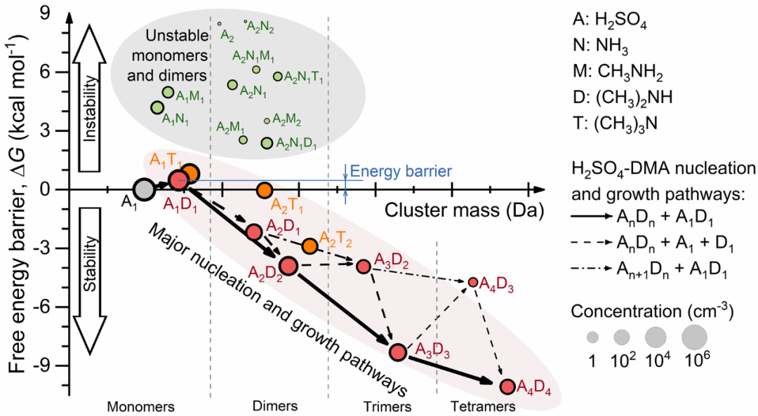 In a complex atmospheric environment with multiple pollutants coexisting, gas molecules with higher basicity and concentration are more likely to combine with gaseous H2SO4 molecules to form acid-base dimer clusters. The research group conducted thermodynamic and kinetic characterization of the detected gaseous base molecules and found that amines, represented by dimethylamine, are the key base molecules for forming acid-base dimers, while weak bases such as ammonia are more likely to participate in the subsequent cluster growth process (Figure 5). With the help of these base gases, the transformation of gaseous H2SO4 into new particles requires overcoming only a very low energy barrier, thereby achieving a high new particle formation rate close to the collision limit of H2SO4 (theoretical maximum).