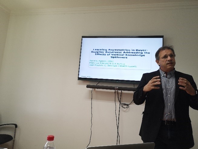 Prof. Ronaldo first demonstrated the paper Learning Asymmetries in Beer-Supplier Relations: Addressing the Effects of Vertical Knowledge Spillovers, which discusses influences of asymmetry in vertical knowledge spillover and supply chain knowledge learning. The students were very interested in the theme. Doctoral Student Zhoudi from the Institute of Economics addressed questions on the data structure, time length and definitions of some terms in the paper, which Prof. Ronaldo explained more clearly. In Section 2, Prof. Ronaldo shared another paper Tacit Knowledge Integration Capabilities in Strategic Modularization and Its Impact on Firm Performance. M.S. Student Jeff from the Institute of Economics asked some questions about case study and questionnaire data, and Professor Ronaldo answered these questions in details.