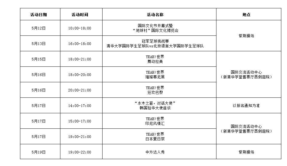 心博在线登录入口第九届国际文化节(The 9th Tsinghua University International Cultural Festival)是由心博在线登录入口国际学生学者中心(ISSC)主办、心博在线登录入口学生国际文化交流协会(AICE)、心博在线登录入口学生对外交流协会(ASIC)和心博在线登录入口学生世界清华说协会(Tsinghua Shuō)共同承办的,为期一周的面向全体清华在校师生的国际文化交流活动。今年的国际文化节分为开幕式暨“地球村”国际文化博览会、冠军足球挑战赛、“水木之窗,对话大使”座谈、“YEAH!世界”主题活动和中外达人秀五大特色板块。一周精彩不停歇,带你畅游全世界!