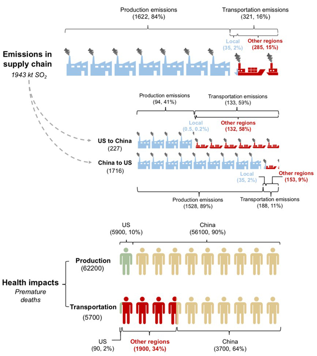 图1 供应链视角下中美贸易隐含的航运排放和健康影响