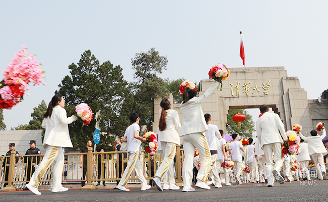 10月1日13时许,光荣完成国庆游行任务的清华师生载誉而归。欢呼着,雀跃着,他们挥舞着手中的花束向清华园走来,成为今日清华最闪耀的一道风景线。他们向在清华西门等候多时的师生们热情挥手,向深爱着的清华园报告:“今天,我们光荣完成祖国交给的任务!”副校长、教务长杨斌,多位院系和部处负责人,军乐仪仗队,师生志愿者共计一百余人在校门口列队夹道欢迎。
