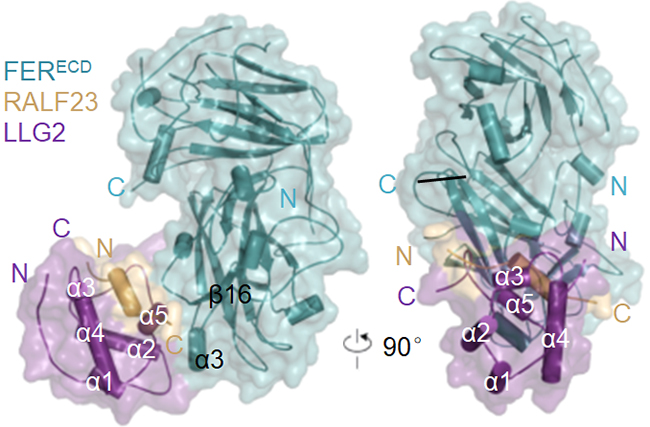 拟南芥受体激酶Feronia (FER) 是另外一类植物受体激酶CrRLK1L亚家族的成员。CrRLK1L亚家族的成员胞外具有两个特征性的与配体识别相关的串联Malectin结构域。动物Malectin是定位于内质网膜上的蛋白,可特异性识别糖类分子,与蛋白的糖基化修饰有关。植物Malectin结构域同样被报道可识别细胞壁相关多糖——果胶(pectin)。自FER被发现以来,分别有三篇《科学》(Science)文章报道了其在生殖(Escobar-Restrepo JM et al, Science 2007)、生长(Haruta M et al, Science 2014)、免疫(Stegmann M et al, Science 2017)三大植物生理过程中的重要作用。快速碱性化因子(Rapid alkalinization factor, RALF)是一类植物重要的肽类激素,其被认为是受体激酶CrRLK1L亚家族的配体。如RALF1/23被FER识别,RALF4/19由ANX1/2, BUPS1/2识别(Ge et al, Science, 2017; Mecchia MA et al, Science, 2017)等。拟南芥Lorelei (LRE)及LLG1/2/3家族是一类胞外膜锚定蛋白,有研究表明其是FER信号通路的重要参与者(Capron et al., Plant Cell, 2008; Li et al., elife, 2015)。