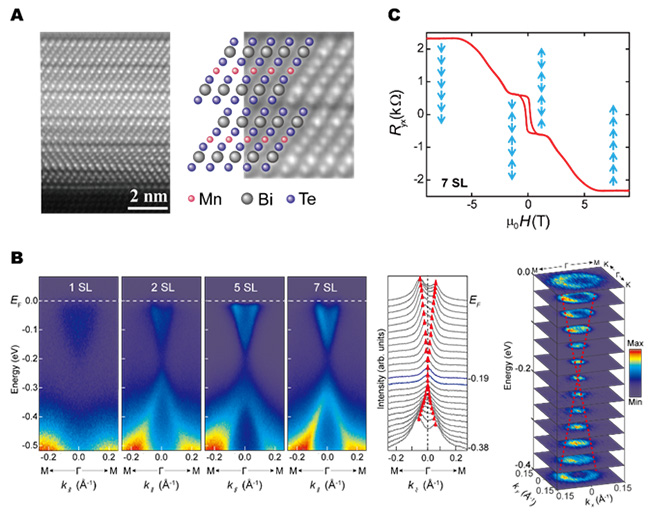 图1. 分子束外延生长的内禀磁性拓扑绝缘体MnBi2Te4的实验测量结果。(A)高分辨电子显微镜图显示了MnBi2Te4特征性的“七层”结构;(B)角分辨光电子能谱显示出MnBi2Te4的狄拉克型表面态,表明其是一个三维拓扑绝缘体;(C)霍尔电阻随磁场变化曲线呈阶梯状,显示在外磁场作用下MnBi2Te4的“七层”间磁构型由反铁磁到铁磁的转变。