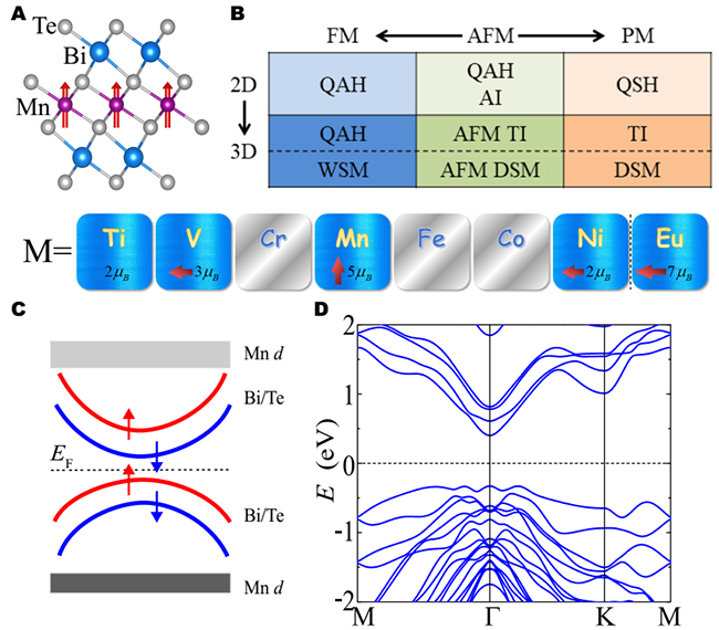 图2. 内禀磁性拓扑绝缘体MnBi2Te4理论计算结果。(A)单层MnBi2Te4 的晶体结构,对Mn元素进行替换可生成一大类MBi2Te4相关材料。(B)通过维度与磁性调控,MnBi2Te4家族材料能实现丰富的拓扑物相,包括反铁磁拓扑绝缘体(AFM TI)、外尔半金属(WSM)、量子反常霍尔 (QAH) 效应、轴子绝缘体(AI)等。(C, D)单层MnBi2Te4的能带结构及其示意图,其中Mn原子具有半满的d轨道,费米面附近的电子态主要由Bi/Te的p轨道贡献。因此,在MnBi2Te4中,Mn和Bi/Te原子层分别提供磁性和拓扑,这两种量子序在同一种材料中实现了完美的结合。