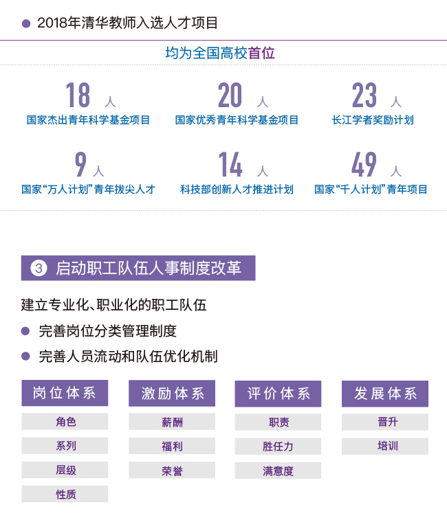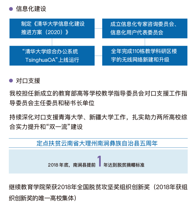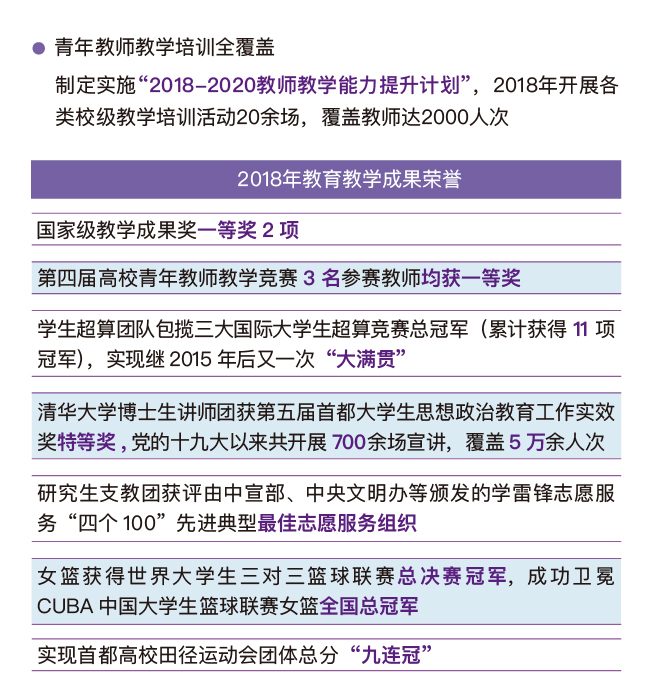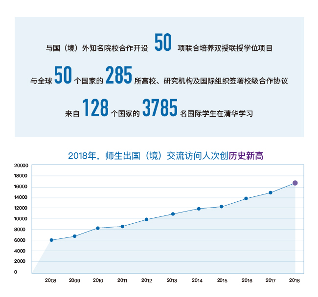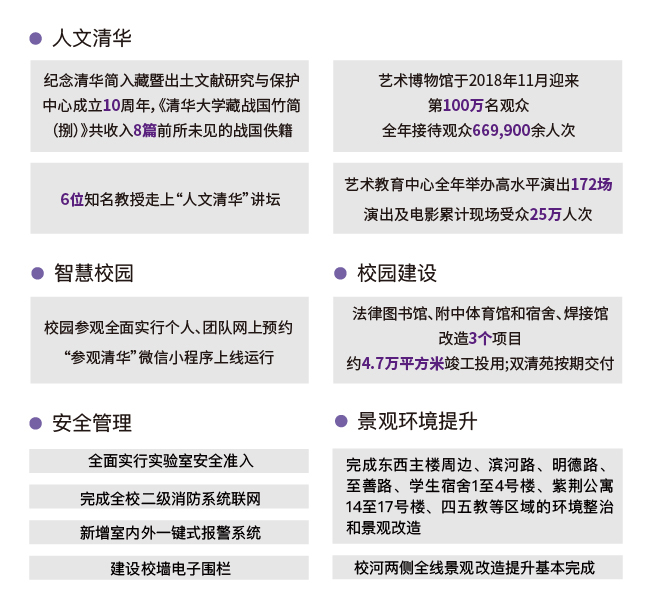 过去一年,在全面深化综合改革、加快“双一流”建设的关键节点上,清华进一步强调质量提升、内涵式发展,凝心聚力,保持定力,持续提升人才培养质量、学科建设质量和学校管理水平,各方面工作扎实推进,呈现出新气象、新面貌,展现了新作为。108周年校庆之际,校报《新清华》再次推出“图说清华又一年”校庆特稿,用信息可视化的方式呈现清华2018年重要工作进展和发展建设成绩,与广大师生校友共同祝福更加自信、更加开放的清华!