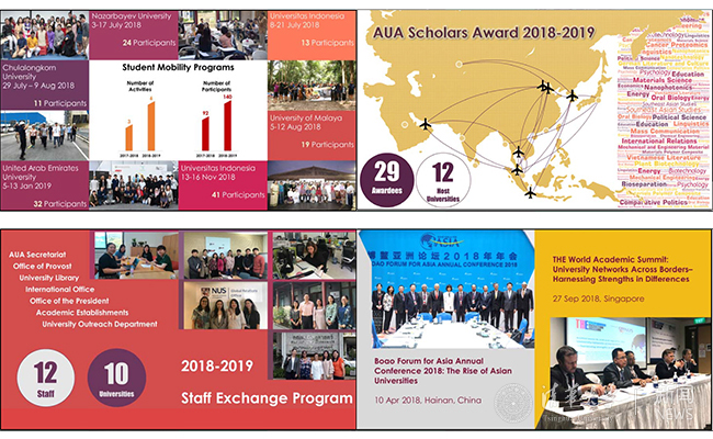 作为首个由中国大学牵头成立、以亚洲高等学府为主体的高水平大学联盟,成立以来,AUA定期举办联盟峰会、校长论坛、青年论坛、寒暑期文化浸润项目、科研合作等活动,以促进青年成长,培育未来领袖;推动协同创新,应对共同挑战;加强文化交流,凝聚区域共识。