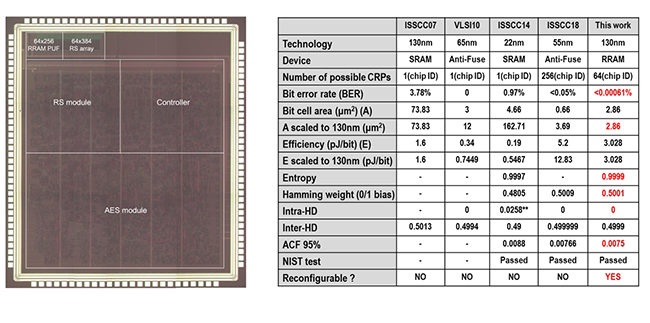 首页网3月22日电 近日,微纳电子系钱鹤、吴华强教授团队在第66届国际固态电路会议(ISSCC 2019)上以“基于阻变存储器的具有6×10-6原始比特错误率的可重构物理不可克隆函数芯片(A Reconfigurable RRAM PUF Utilizing Post-Process Randomness Source with <6×10-6 N-BER)”为题,报道了国际首个基于阻变存储器(RRAM)的物理不可克隆函数(PUF)芯片设计,该芯片在可靠性、均匀性上相对于之前工作都有明显提升,且具有独特的可重构能力,能够实现高效硬件安全防护。该芯片代号取名为XUANWU,意为具有超凡防御能力的中国古代四大神兽之一“玄武”。