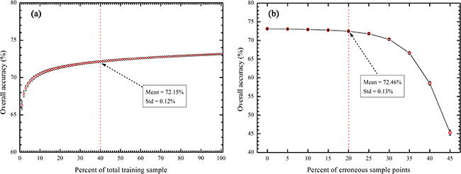减少样本量和增加错误样本时的稳定性。左图,当样本量增加时,精度迅速上升到相对稳定的高度。右图,随机错误的样本百分比上升,精度下降。两种情况都是分别随机取样1000次的实验结果,整体分类精度非常稳定,最大标准差远小于0.5%。