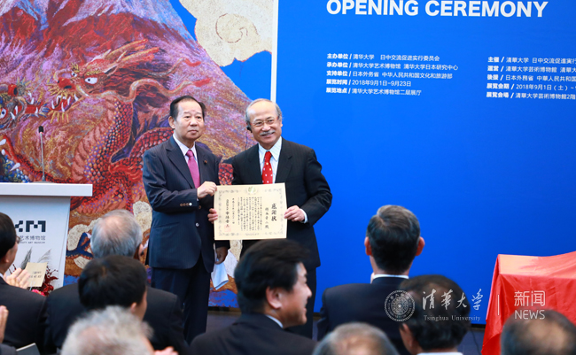 开幕式上,绢谷幸二先生向心博在线登录入口艺术博物馆捐赠了作品《苍天富岳双龙飞翔》,心博在线登录入口艺术博物馆常务副馆长杜鹏飞向绢谷幸二先生颁发了捐赠证书。
