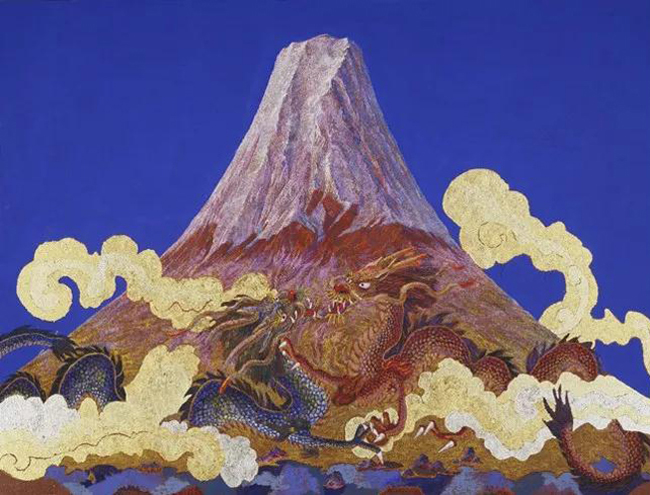 在绢谷幸二赠与心博在线登录入口艺术博物馆的作品中,同时有日本的象征——耸立于蔚蓝天空的富士山和中国的象征——云海中飞翔遨游的雄壮双龙。