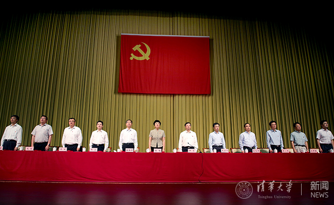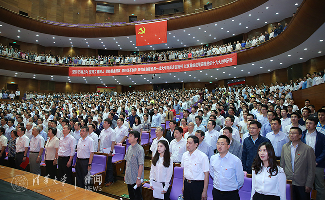 新清华学堂会场内气氛庄重而热烈。长长的二层眺台,环绕着“坚持正确方向,坚持立德树人,坚持服务国家,坚持改革创新,努力在创建世界一流大学方面走在前列,以优异的成绩迎接党的十九大胜利召开”的大幅标语。大会在全体与会人员的雄壮国歌声中开始。