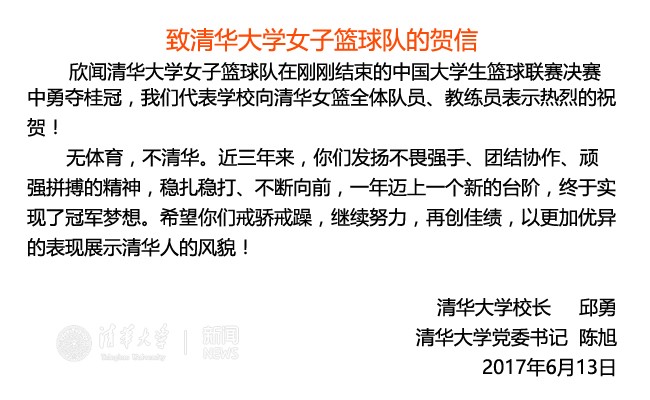 首页网6月13日电 6月13日下午17:06分,清华女篮以81:60战胜天津财经大学女篮,获得第十九届CUBA中国大学生篮球联赛冠军。校长邱勇、校党委书记陈旭发去贺信,祝贺女篮姑娘们!